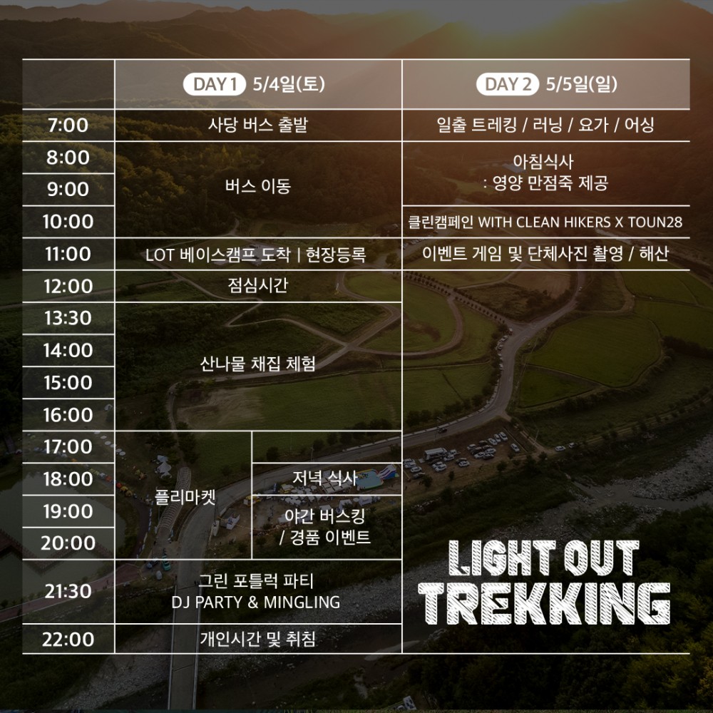 - 2일차 : 영양만점죽 | 일출트레킹, 어싱, 러닝, 요가 | 클린 하이커스 클린캠페인 | 경품이벤트