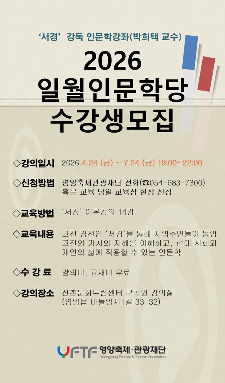 - 이전글2026 일월인문학당('서경' 인문학강좌) 수강생 모집 26.04.10